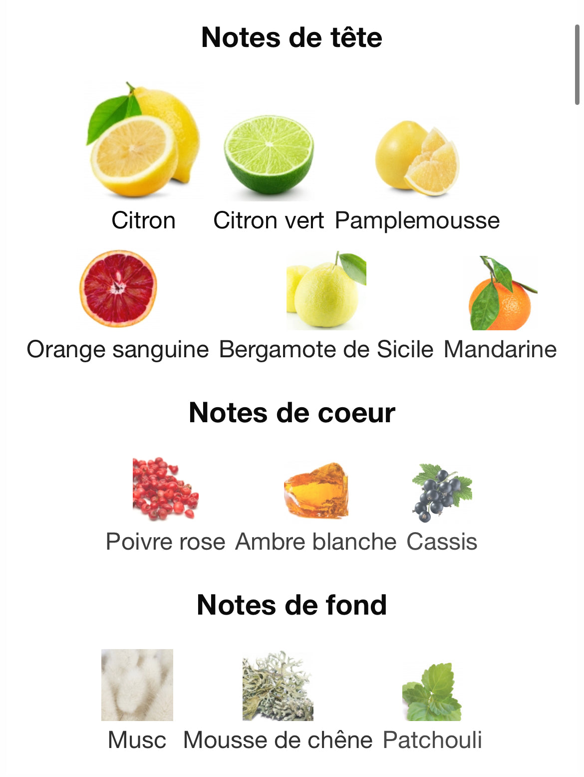 Notes de tête : bergamote italienne, orange sanguine, citron vert, pamplemousse, mandarine — explosion d’agrumes éclatants.